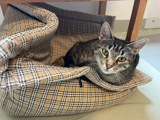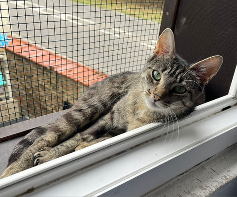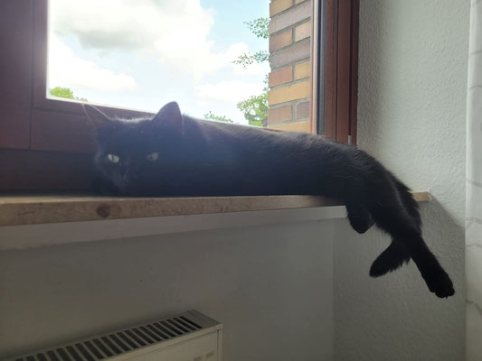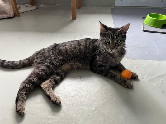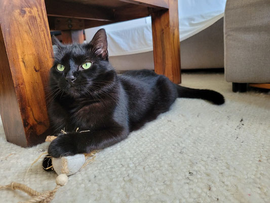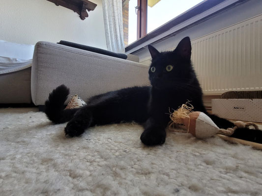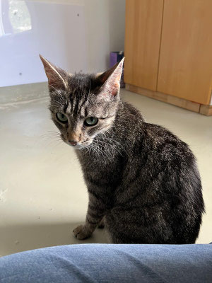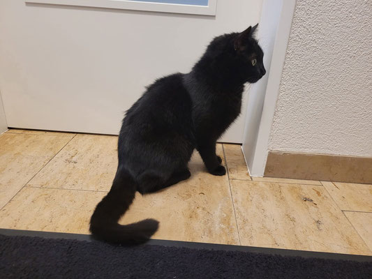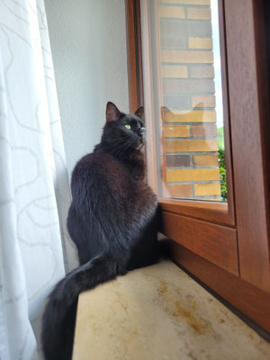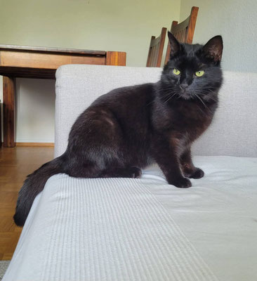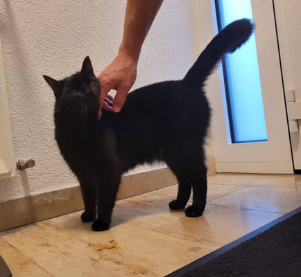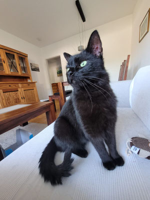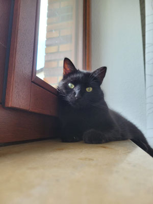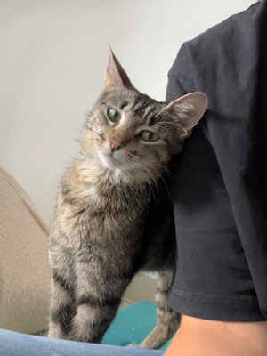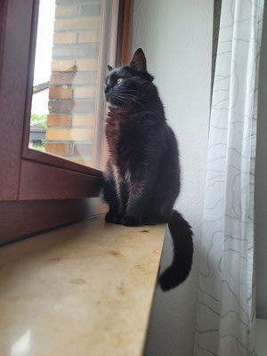 Sie ist stolze Freigängerin, liebt es aber auf dem Schoß zu sitzen und gestreichelt zu werden und ist sehr sanft mit ihren Menschen. Nachts schläft sie oft am Bettende. Vermutlich wäre eine