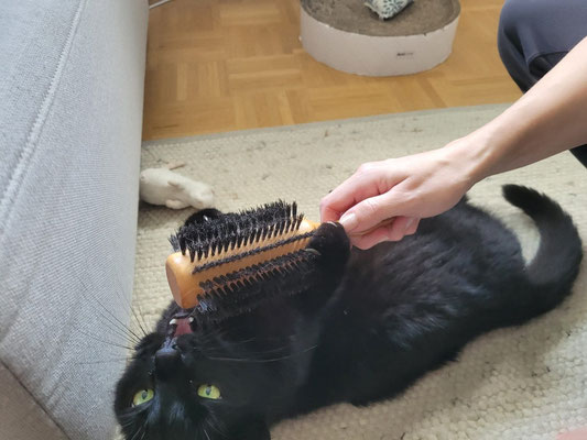 Ich liebe lange Streicheleinheiten und suche immer wieder Kontakt zu meinen Menschen. Wenn man mein Fell bürstet finde ich das echt toll.